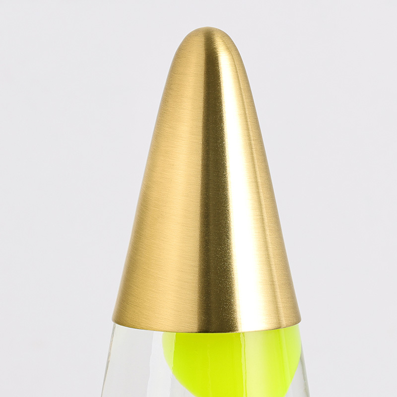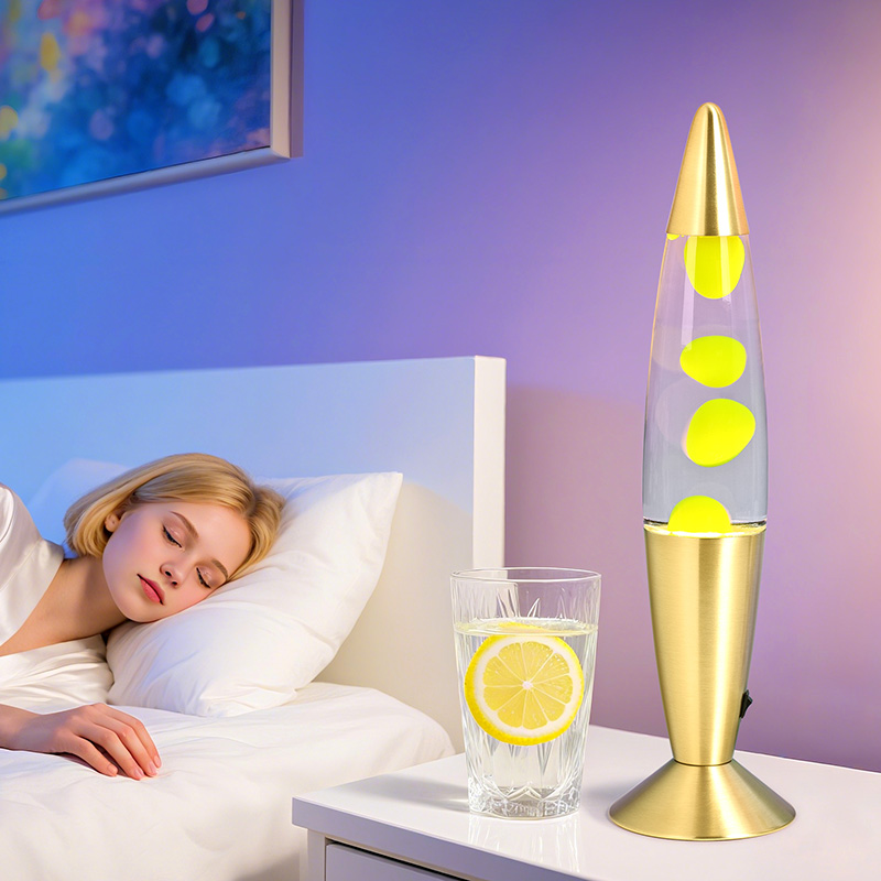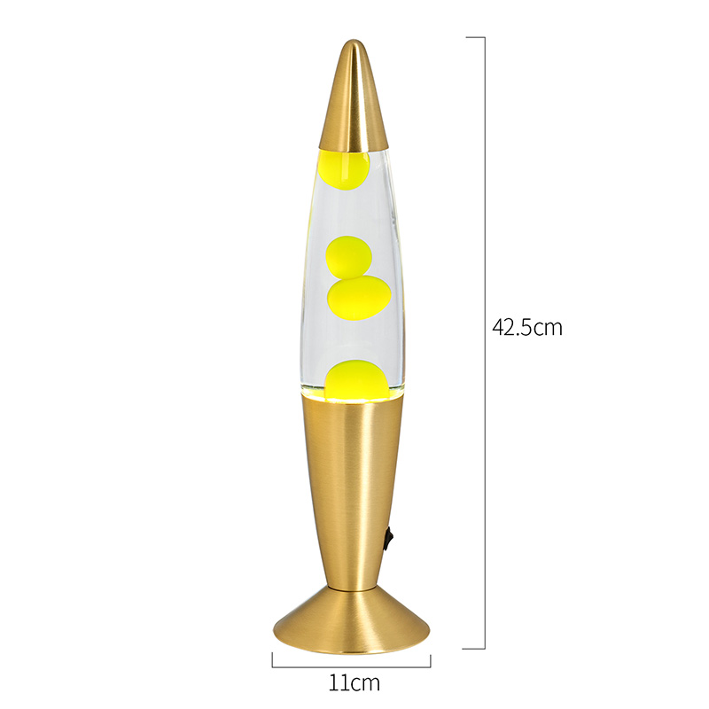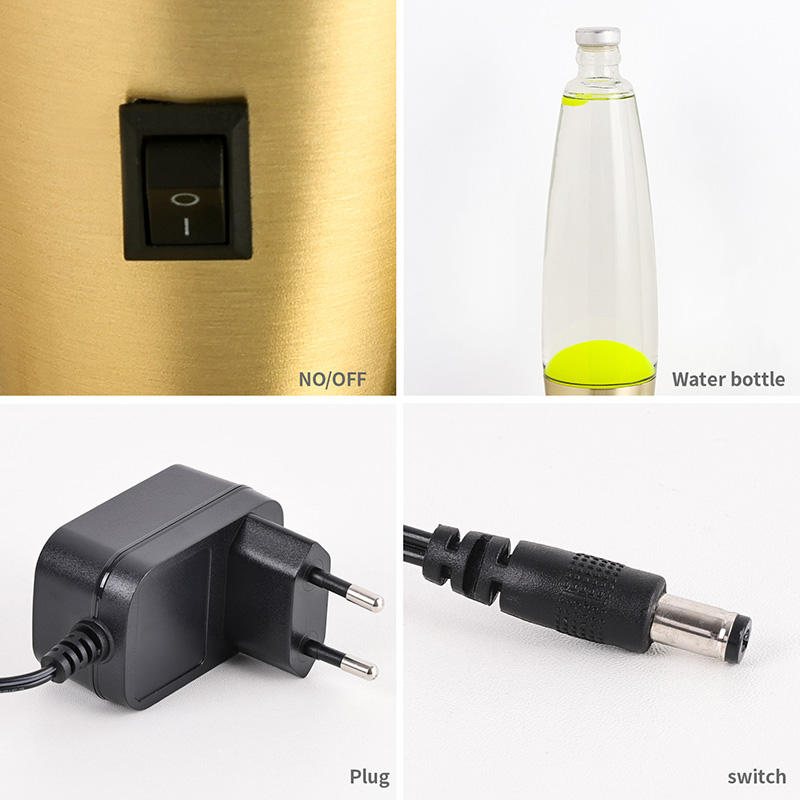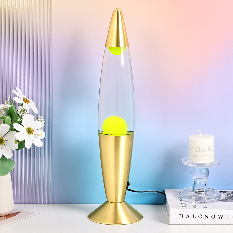 24V16 tommers luksus oransje lavalampe vokslampe har rent vann inni det gjennomsiktige glasset og grønn voks inni. Etter å ha blitt varmet opp flyter voksen uregelmessig i vannet, noe som settes stor pris på.
