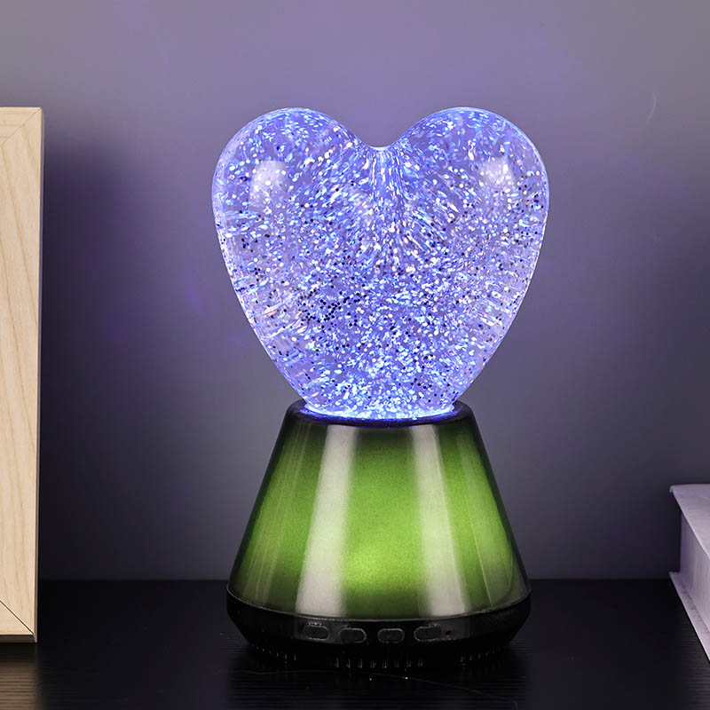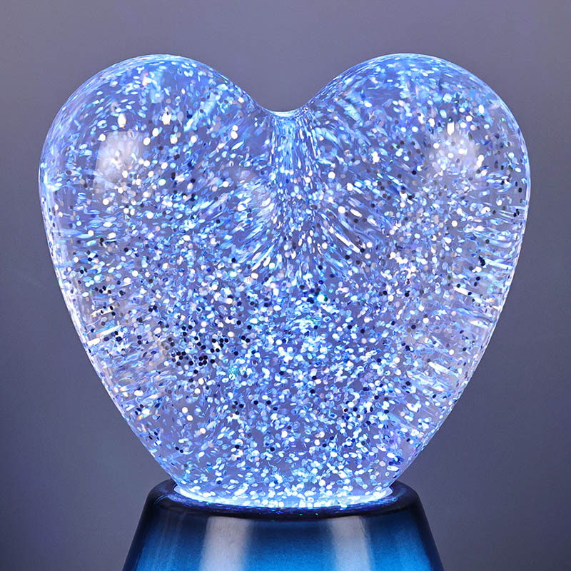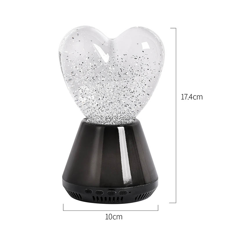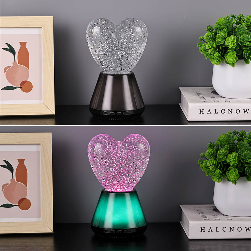 Interiøret til Bluetooth kontroll LED glitter hjerte nattlys er fylt med en mystisk væske, der utallige glitrende paljetter flyter. Når lampen slås på, vil væsken sakte strømme inn i den hjerteformede glasskulen, og skape en drømmeaktig effekt. Disse paljettene virker som spredte stjerner, som flyter forsiktig i væsken, og gir folk en følelse av å være på stjernehimmelen. Enten det er dag eller natt, med hjerteskygge kan det bringe overraskelse og glede til barn, slik at de kan slippe fantasien løs i den drømmende belysningen.