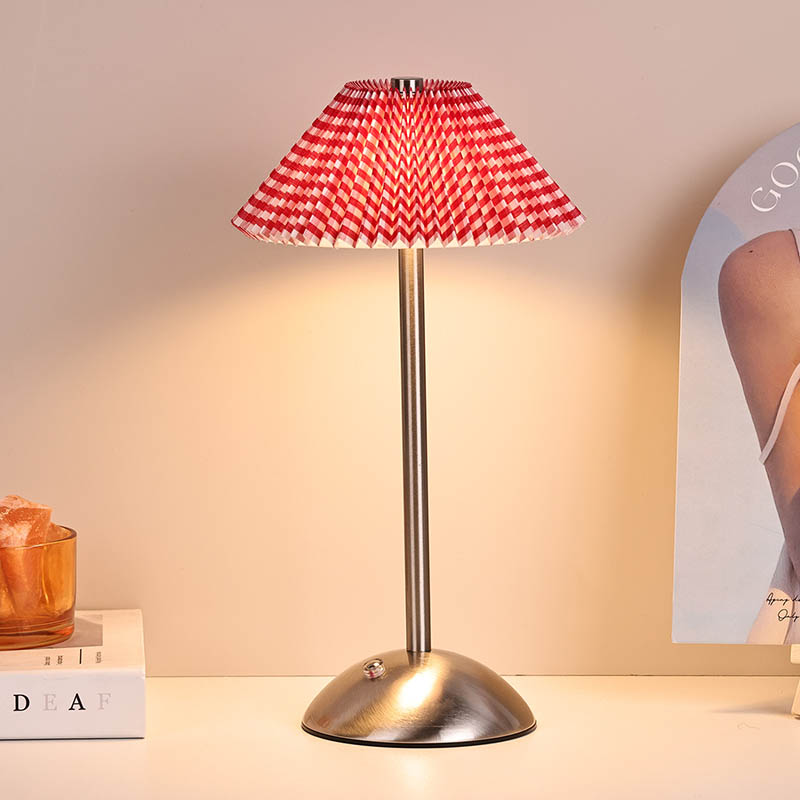 Hver detalj i denne 台灯 er nøye laget for å gi både estetisk appell og funksjonell dyktighet. Den røde og hvite nylon -lampeskjermen, med sin plisserte design, fremkaller en følelse av vintage sjarm. De livlige fargene vil garantert legge til en personlighet i rommet ditt, noe som gjør det til et samlingspunkt i ethvert rom.
