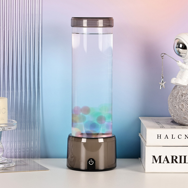Denne lampen er laget med fokus på detaljer, og etterligner utseendet til et ekte akvarium med sin gjennomsiktige sylindriske kropp fylt med klar væske og lysende manetfigurer som flyter grasiøst innenfor. Den myke gløden fra det interne LED-systemet forbedrer bevegelsen til manetene, og skaper en fengslende bokeh-lignende effekt som ligner selvlysende skapninger som driver i dypt vann. Enten den plasseres på et nattbord, skrivebord, hylle eller stuebord, gir denne lampen et snev av eleganse og undring til ethvert miljø.