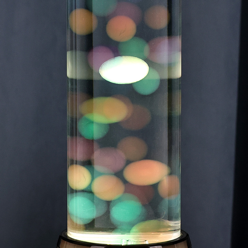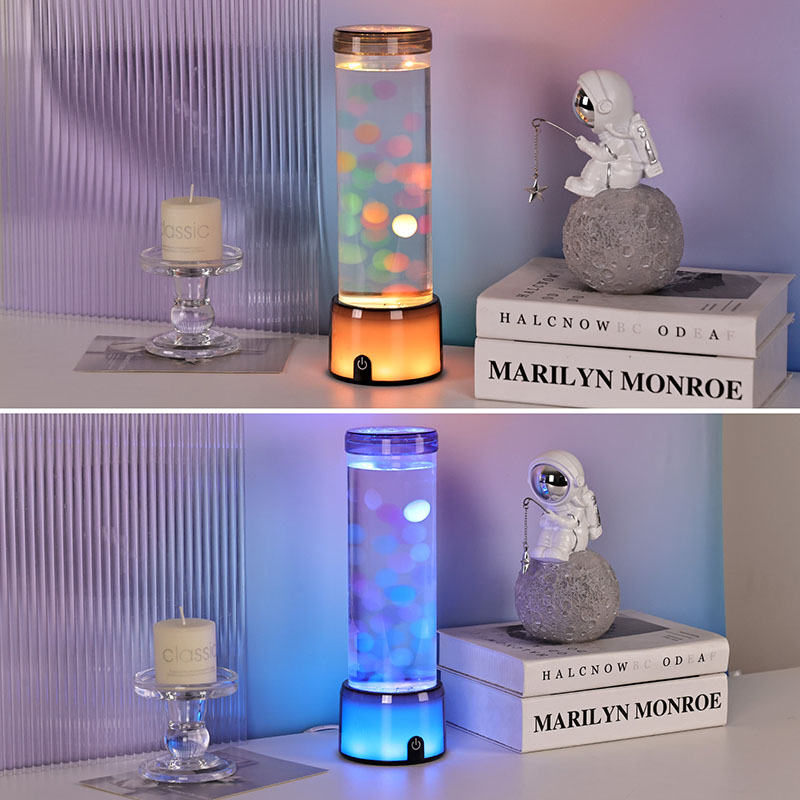 Lampens høye, elegante sylinderform gir den et moderne, minimalistisk utseende som komplementerer ulike interiørstiler. Den gjennomsiktige kroppen tillater full synlighet av de indre elementene, inkludert de flytende manetene og de glitrende lysrefleksjonene. Væsken på innsiden er spesielt formulert for å simulere vannstrøm, noe som forsterker realismen i den flytende bevegelsen. Når lysdiodene skifter farger, ser det ut til at manetene pulserer av liv, og legger til dybde og bevegelse til scenen.