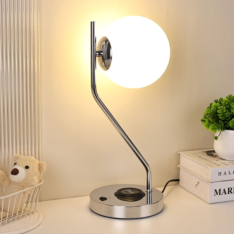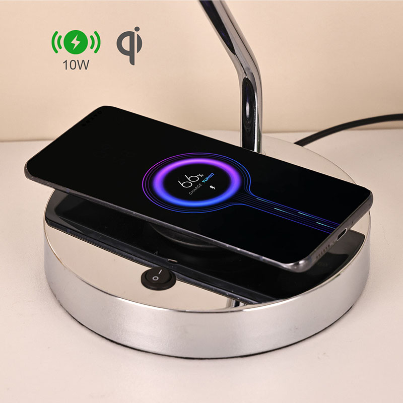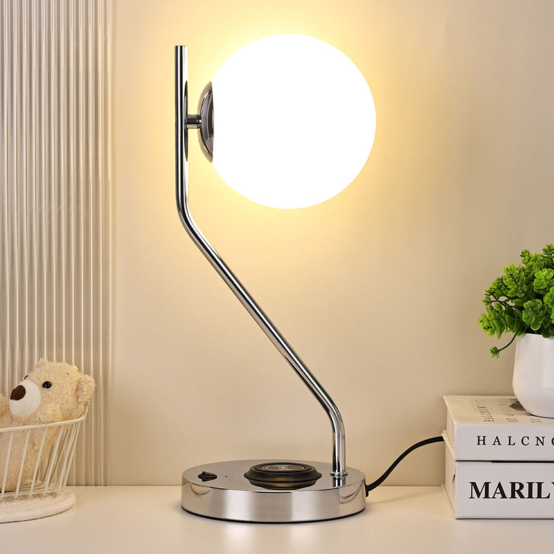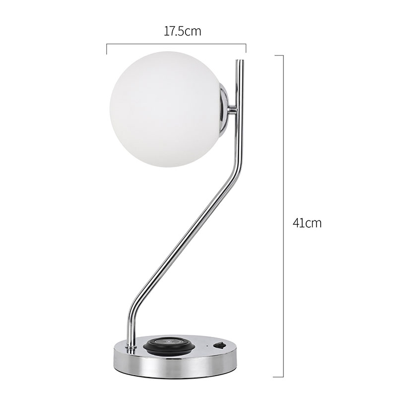 Bordlampe i glassskjerm med trådløs lader er også utstyrt med en trådløs ladebase for mobiltelefoner i metall. Bare plasser den trådløse ladeaktiverte telefonen forsiktig på basen for rask lading, uten behov for kjedelig
