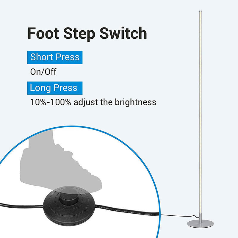 LED-gulvlampen vår er designet med bekvemmelighet i tankene og har en fotbryter for enkel betjening. Bare trå på bryteren for å slå lampen på eller av, noe som gjør det enkelt å kontrollere belysningen uten å måtte famle etter knapper eller brytere. Denne gjennomtenkte designdetaljen forbedrer den generelle brukeropplevelsen, og sikrer at betjeningen av lampen er så enkel og intuitiv som mulig.