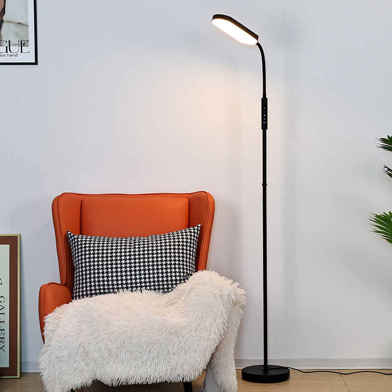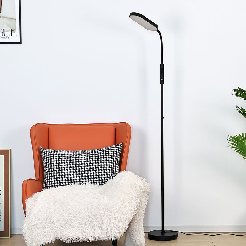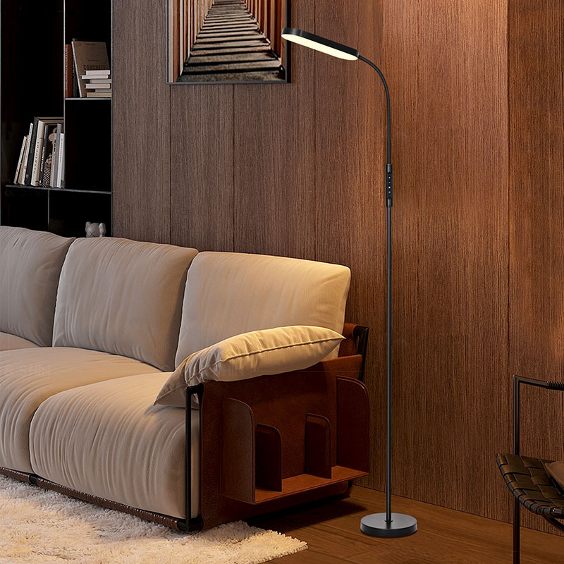 Moderne LED-stående lampe for stue tar i bruk et minimalistisk designkonsept, med en enkel og lineær generell form. Den enkeltpolede designen sparer ikke bare plass, men gir også belysningsarmaturene en unik estetikk. Den sorte metallstangen og basen er finpolert og behandlet, med en glatt og delikat overflate, myk glans og en lavmælt, men edel atmosfære.