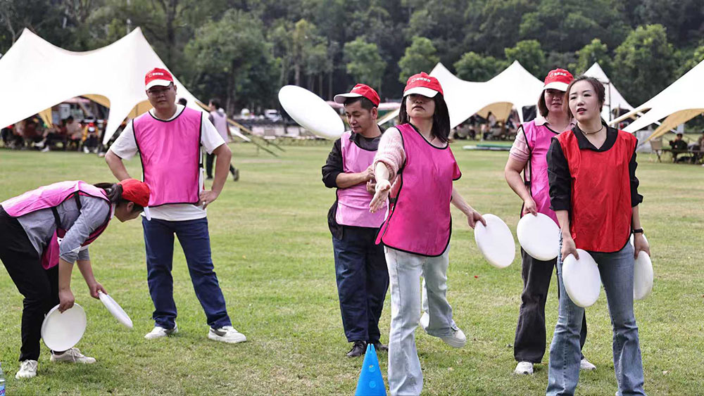Prosjekter fem: Frisbee Nine Palace Grid 🥏 Regel: Kast frisbee fra 3 meters avstand, skyt ned Nine Grid Plate og score 3 sjanser per person. Samle høy poengsum for å vinne. Tid: 20 minutter. Høydepunkt: Presisjon vs. flaks-konkurranse!