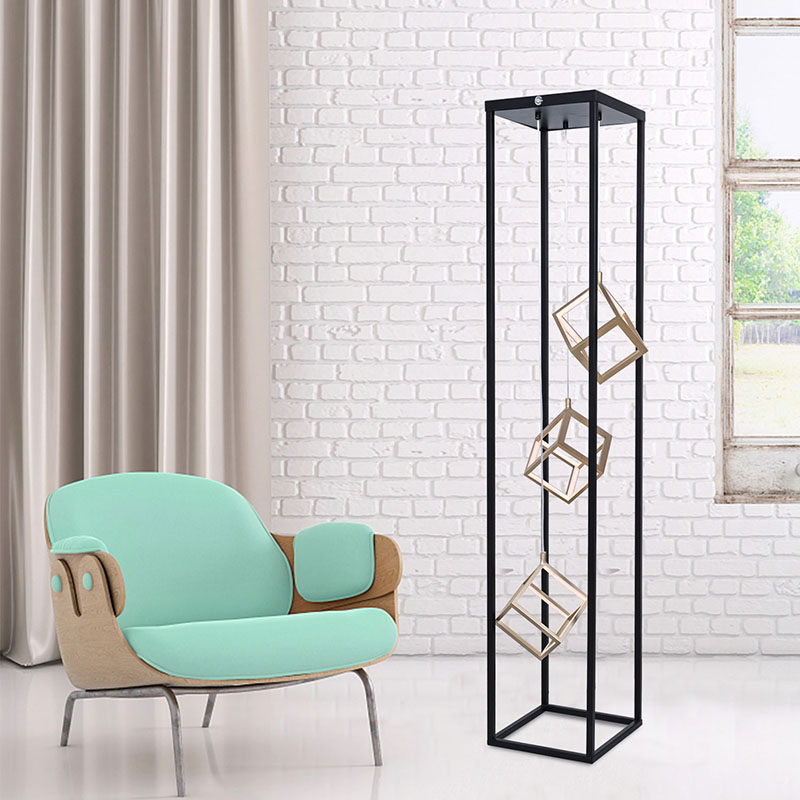 Moderne designet gulvlamper, den største egenskapen til produktet er den rektangulære rammeformen sammensatt av metall, med 3 firkantede LED-lysekroner inni. Det overordnede designet kan brukes som dekorasjon i hallen, og det er en knapp på toppen for å kontrollere lysintensiteten