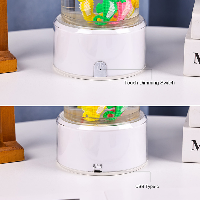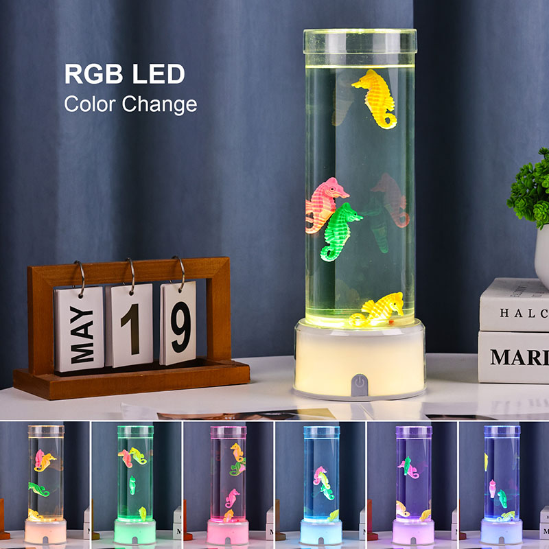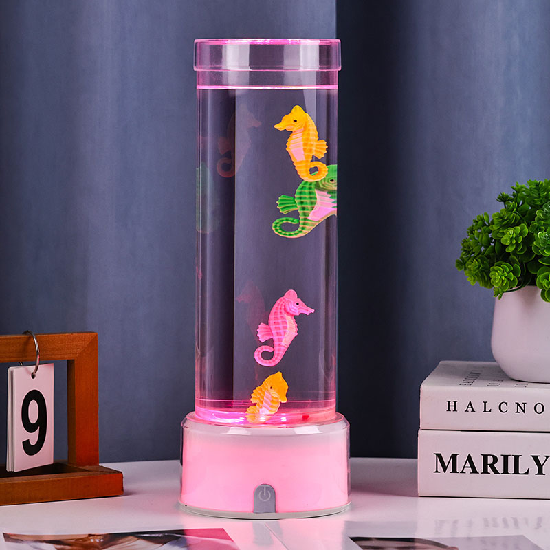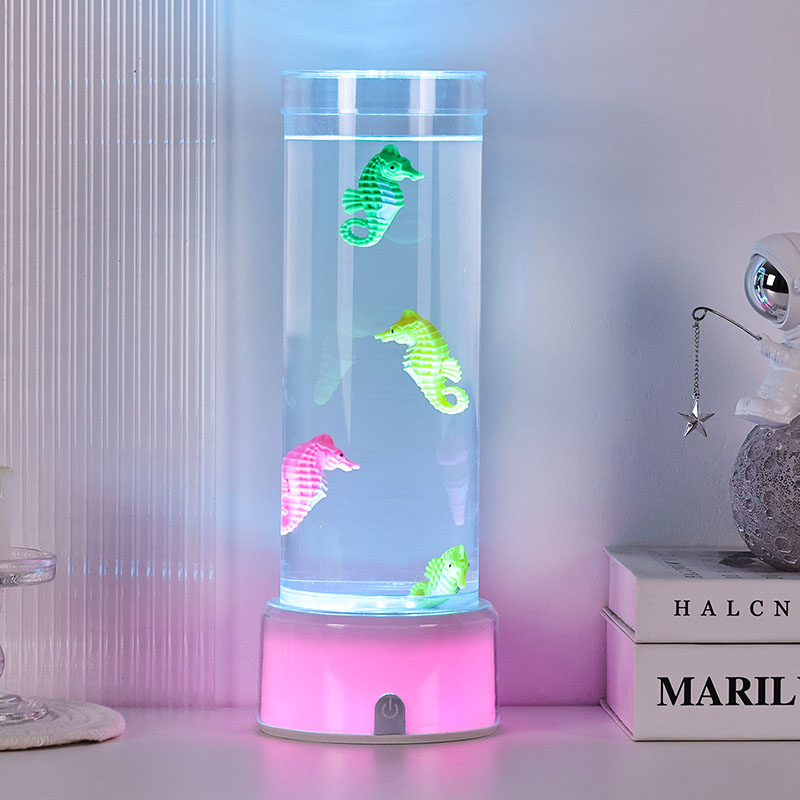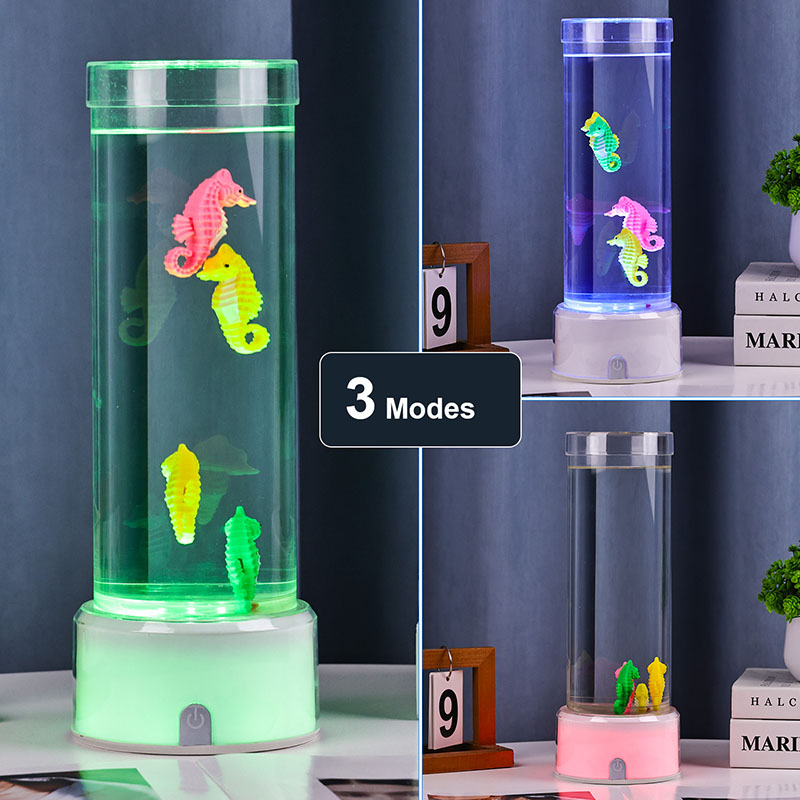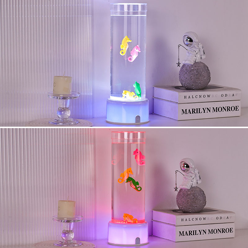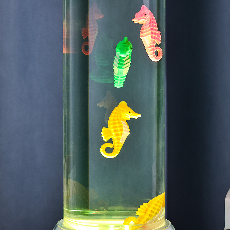 fascinerende undervannsscene som fremkaller havets ro. Hele enheten er laget av slitesterk plast av høy kvalitet som sikrer stabilitet og langvarig ytelse. Lampen er ca. 12 tommer høy med et slankt gjennomsiktig rør fylt med giftfri væske og fargerike sjøhestepynt. drevet av et stille indre sirkulasjonssystem som skaper en naturlig svaiende bevegelse som ligner ekte sjøliv. Denne milde bevegelsen er beroligende å se på og bidrar til å redusere stress samtidig som den gir en beroligende visuell opplevelse