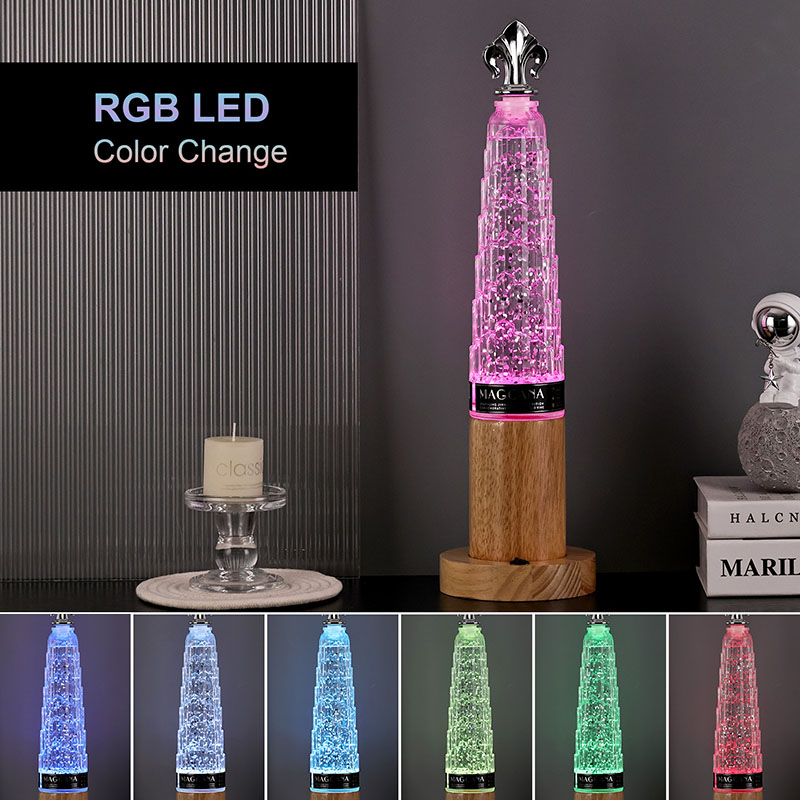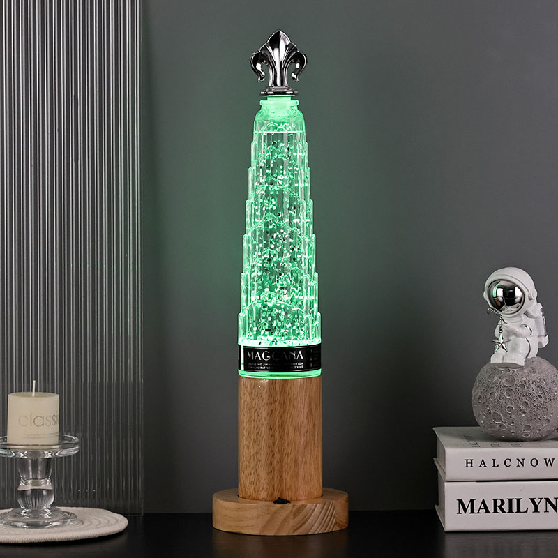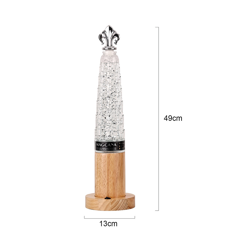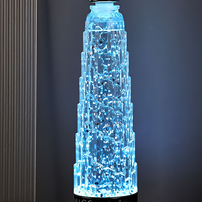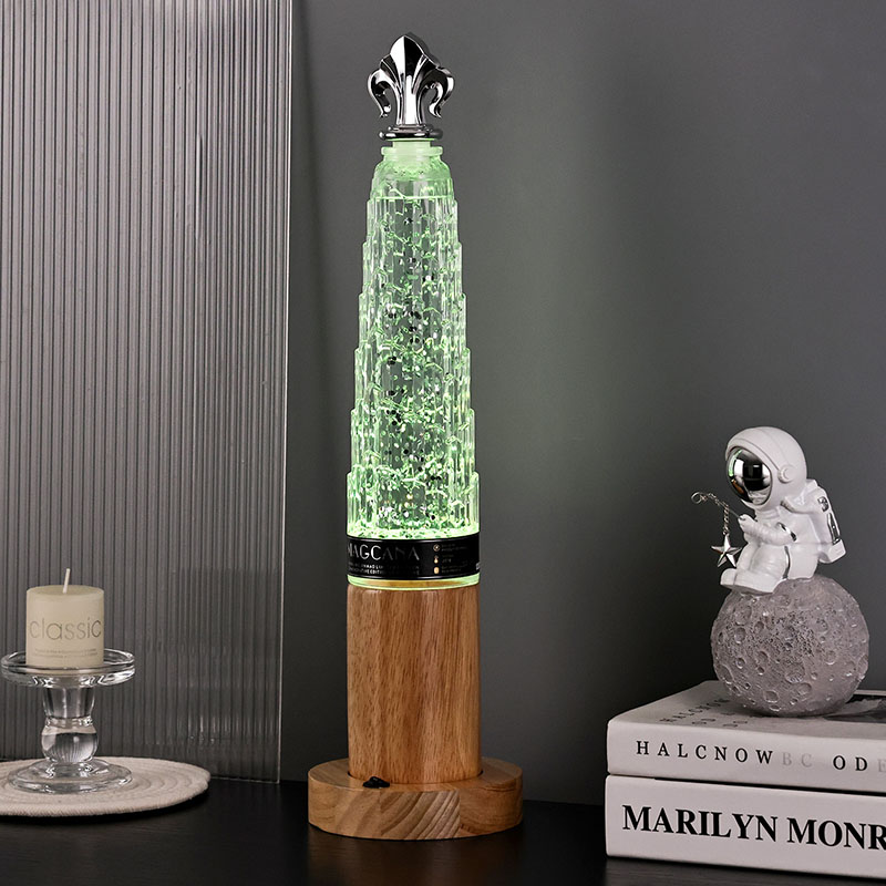 Tårnskygge glitter bordlampe har en klassisk tårnformet design, med utsøkte metalldekorasjoner innebygd på toppen, enkel, men edel. Den gjennomsiktige glassflasken inneholder væske og